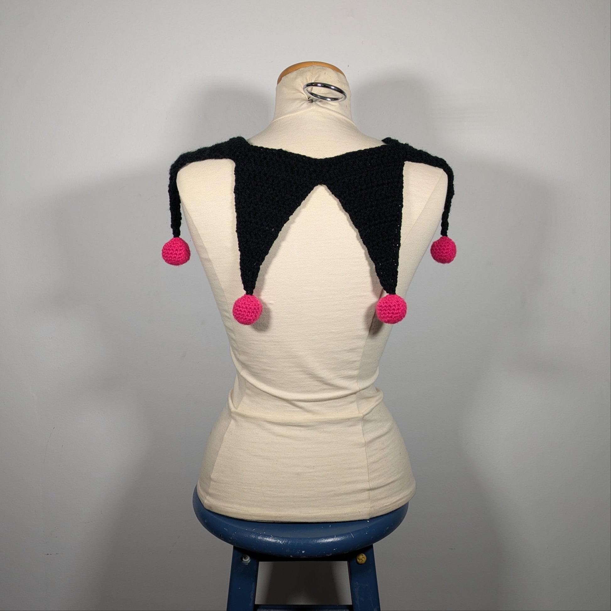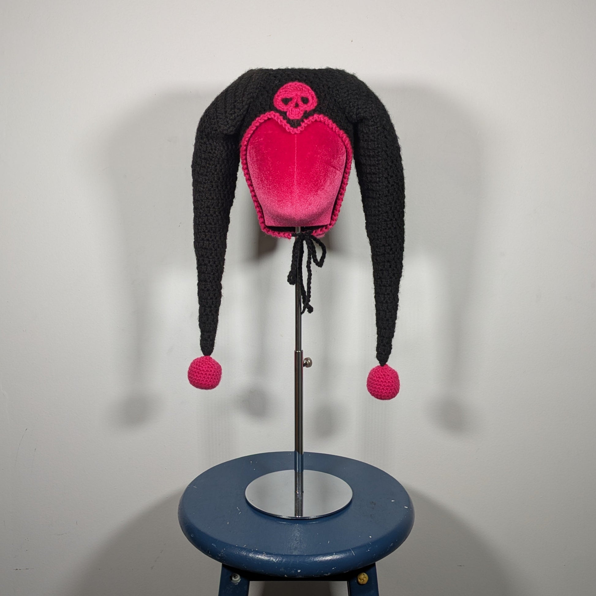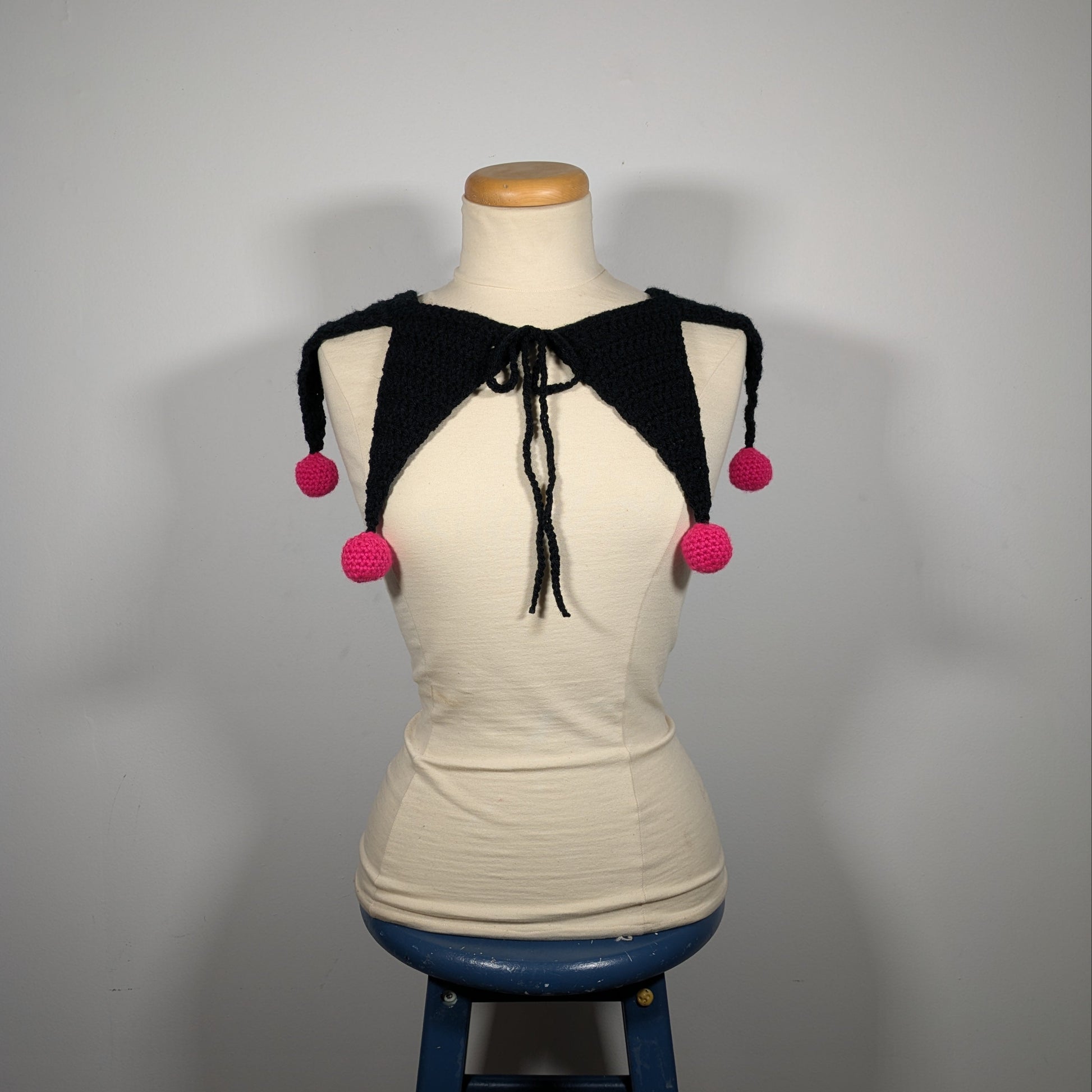 The CUTEST crochet Kuromi jester hat with a matching flag collar! The black bonnet has a widow's peak, bouncy/droopy horns, a skull patch, balls and pink accents. The collar has 6 flags, pink balls and two front ties.