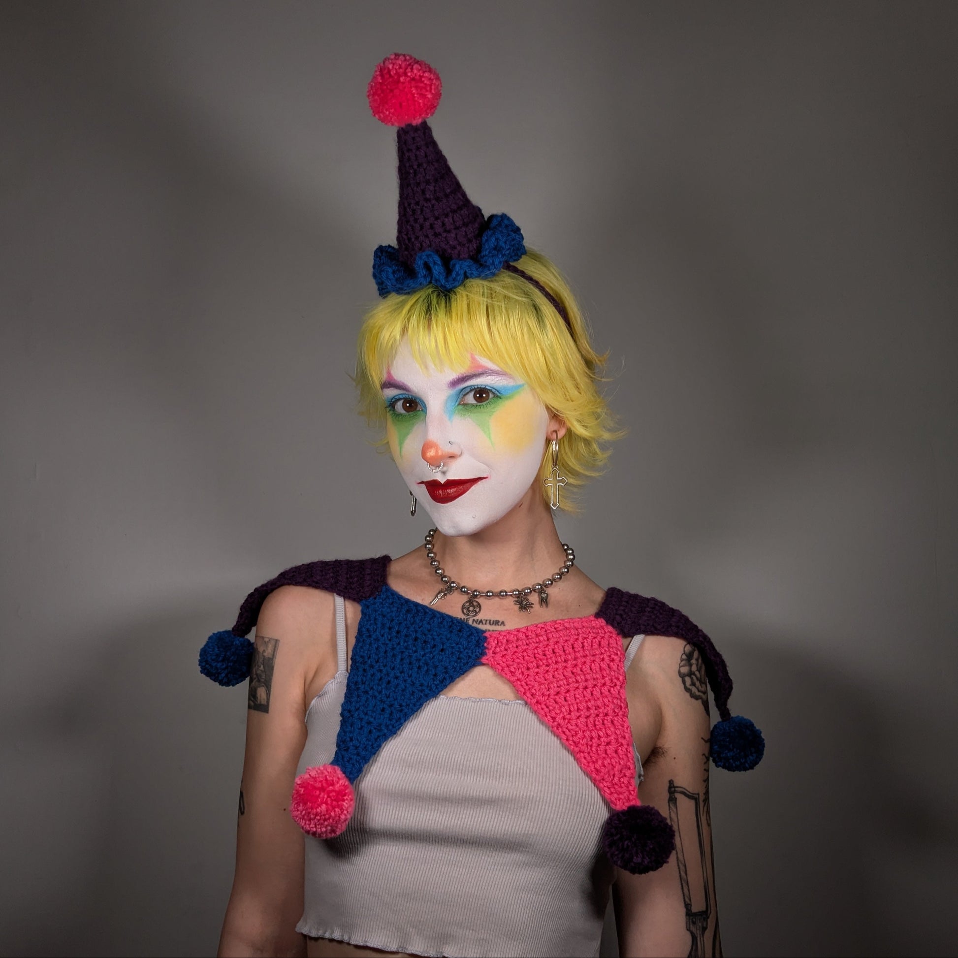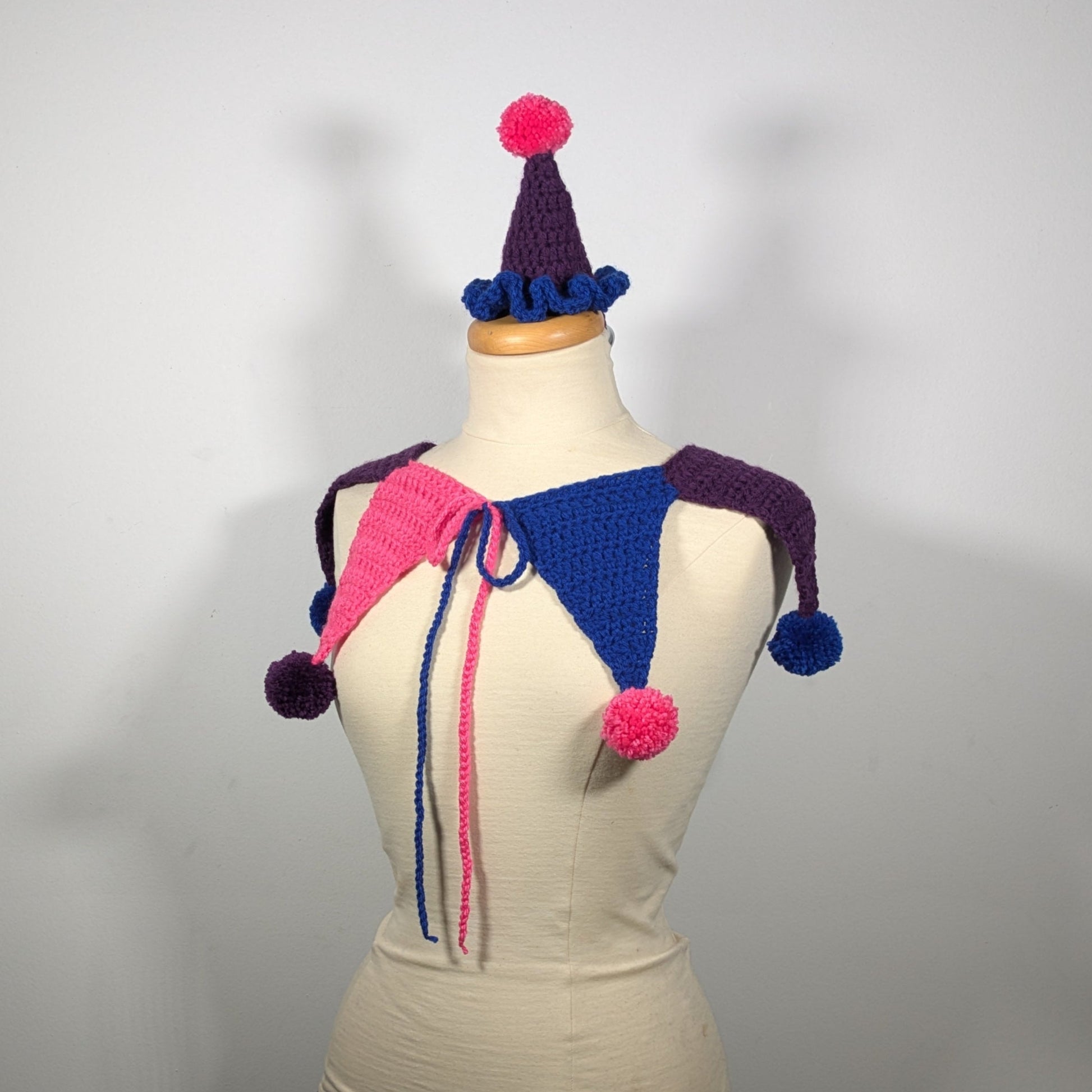 Tags: gay clown set, lgbtq pride clown, crochet clown hat, crochet clown set, crochet clown collar, flag collar, bisexual pride accessory, bi clown set, blue pink purple clown, rave accessory, circus clown accessory, clown clothes, clown costume, matching clown set, trans man accessory, trans woman accessory, lesbian accessory, clowncore hat, clowncore accessory