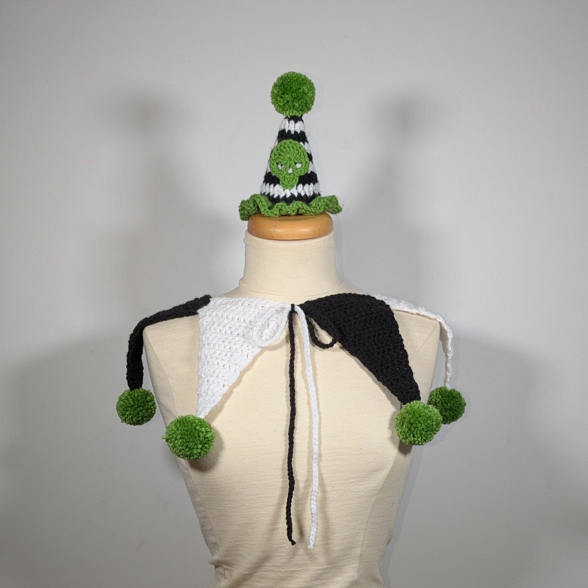 Crochet birthday-style clown hat with a black and white striped body, green ruffles, a green skull patch and two ties to secure under the chin. This set is completed with a matching flag collar.