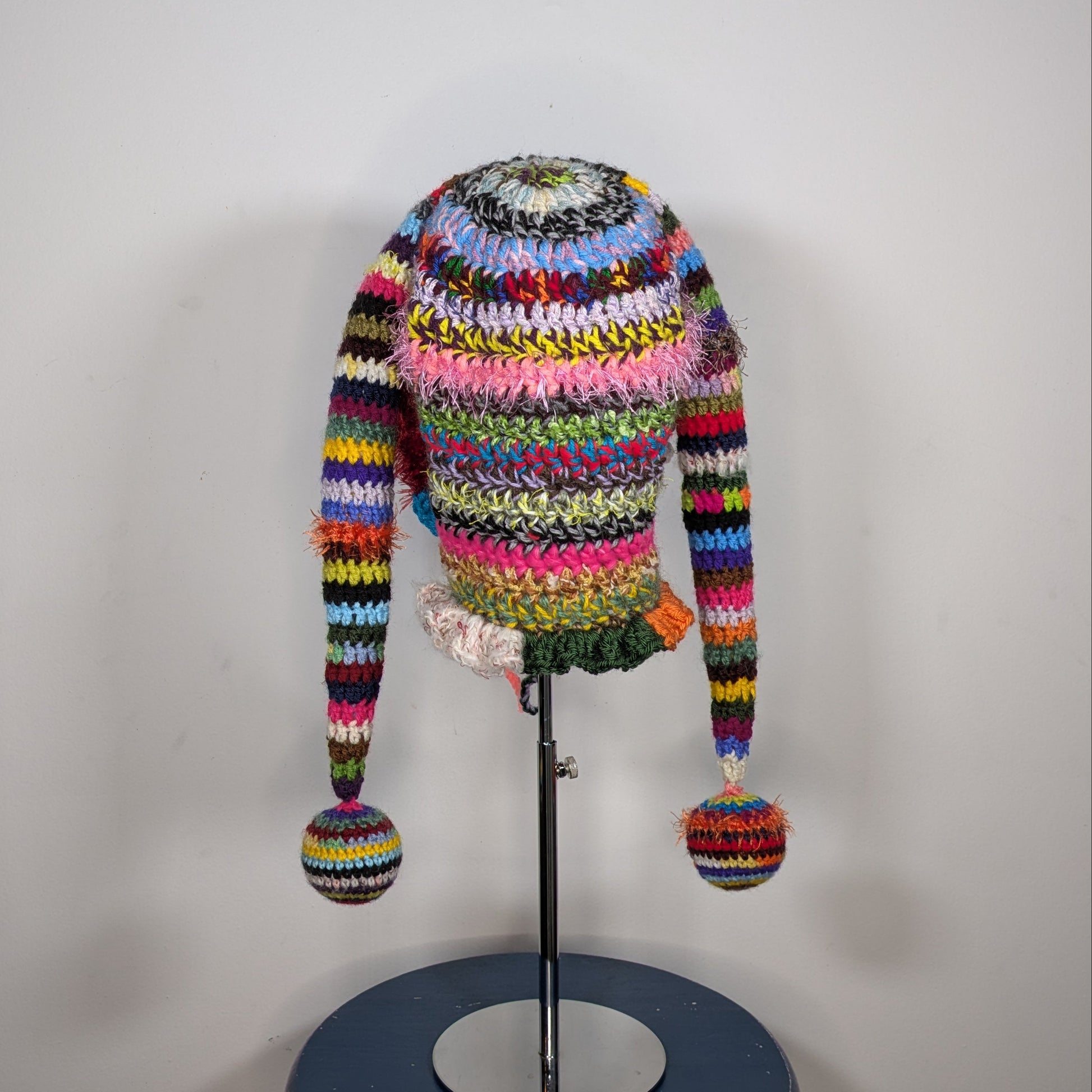 A unique crochet jester hat made entirely of scrap yarn! Every row is a different color, so there is no other hat like this one. This bonnet is constructed with two slouchy horns filled with yarn, and is adorned with ruffles and two balls (also filled with scrap yarn waste).