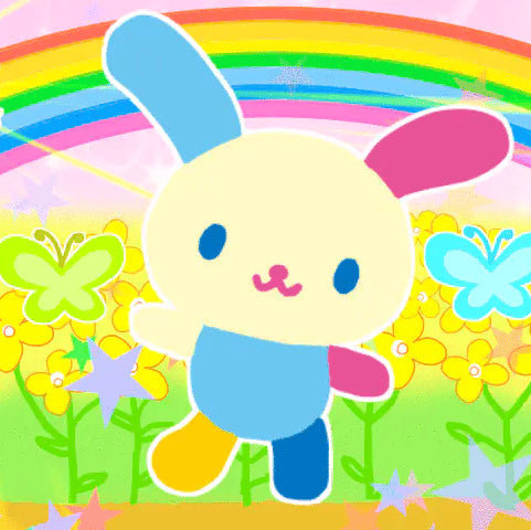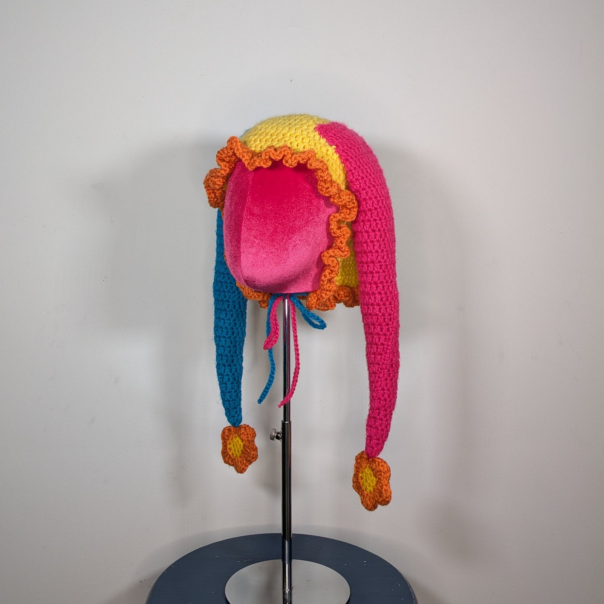 A super cute crochet jester hat made to look like Usahana from Hello Kitty! This hat is made with a pastel yellow bonnet, one pink and one blue slouchy horns filled with scrap yarn, orange ruffles and two orange flowers with a yellow middle.