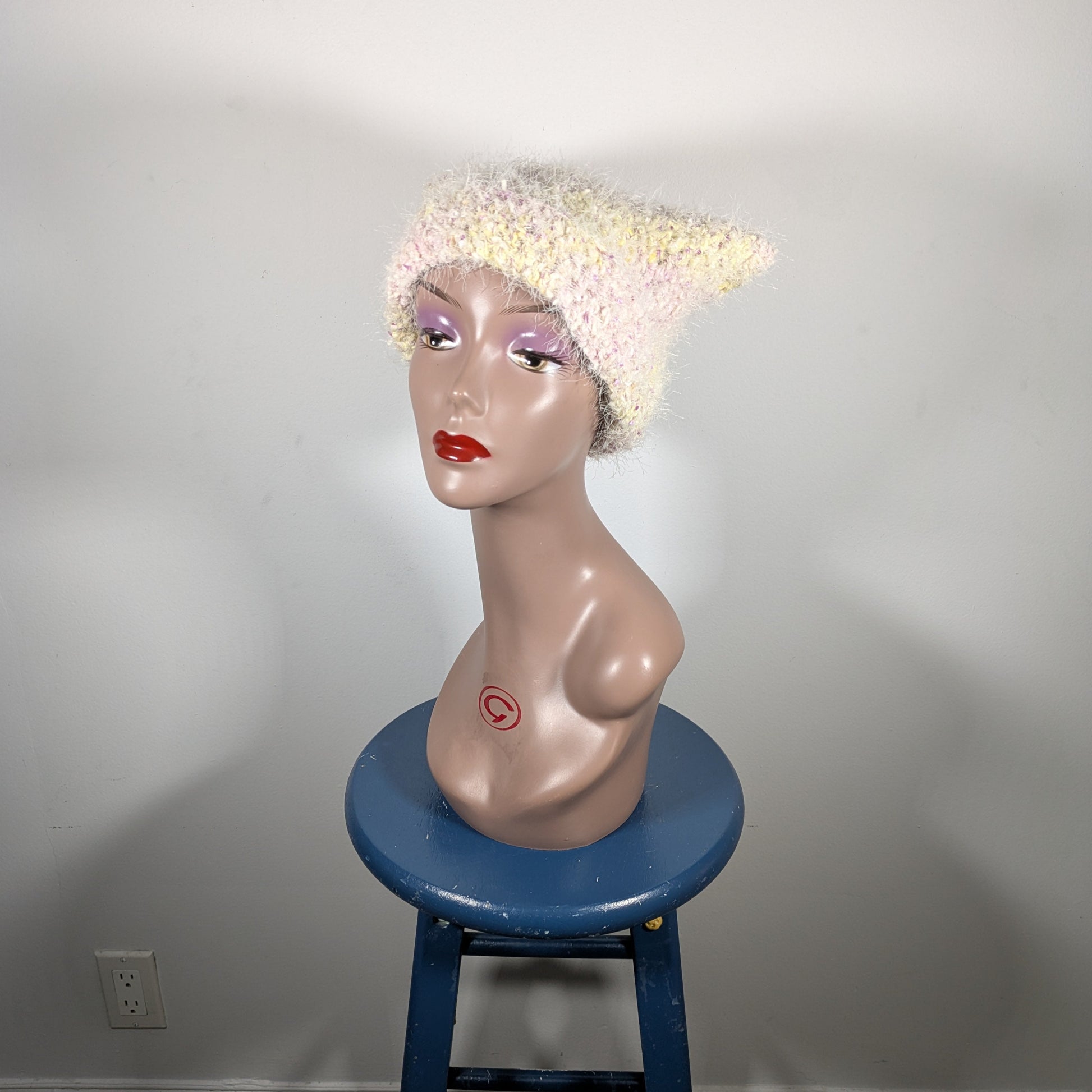 Yellow, white and purple crochet fuzzy cat hat with sparkly yarn. This hat is long enough to fold the brim.